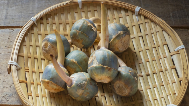 くわいの主な産地は広島県や埼玉県であり、旬の時期は冬が始まる11月から12月にかけて。丸い実のように見えるのは「塊茎(かいけい)」と呼ばれて茎の部分にあたり、泥の中に埋まっています。私たちが食べているのは、この養分を蓄えた塊茎を収穫したものです。ちなみにくわいには青くわいと白くわい、吹田くわいの3種類がありますが、日本で多く栽培され出回っているのは「青くわい」なのだそうです。