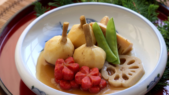 くわいを使ったおせち料理といえば含め煮。くわいの特徴である芽が出ている形を活かせる料理です。くわいのホクホクとした食感やほろ苦さを楽しめますよ。