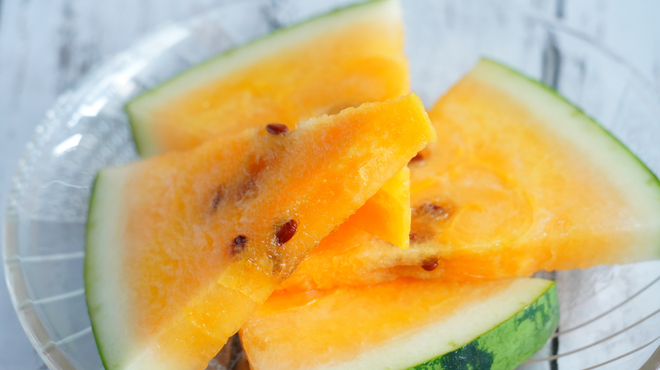 ほんのりと黄色がかった果肉が特徴のすいかで、「クリームスイカ」とも呼ばれています。さわやかな甘みとシャリシャリとした食感を楽しむことができますよ。