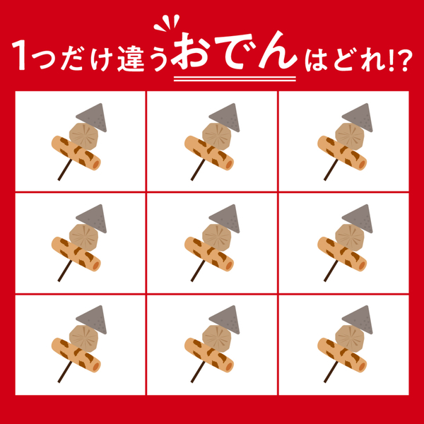 違う絵さがしです!9つ並んでいるおでんのイラストの中に、1つだけ違うものがあります。よーく見比べて、異なるイラストを探し当ててくださいね。