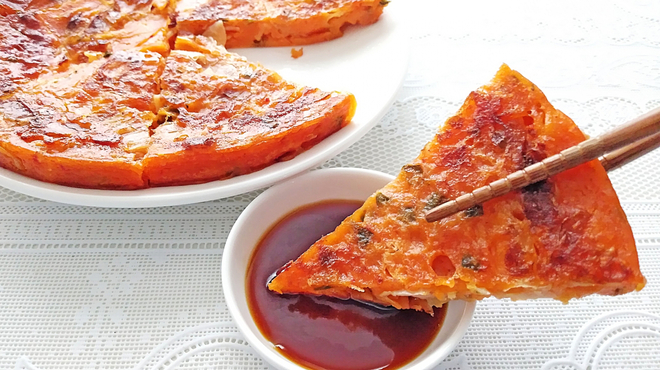 鮮やかなオレンジ色がきれいなにんじんも、チヂミに入れたらおいしいですよ。細切りにして色合いのアクセントにするのもよいですが、すりおろして生地に加えると全体がオレンジ色になり、インパクトのある見た目になります。