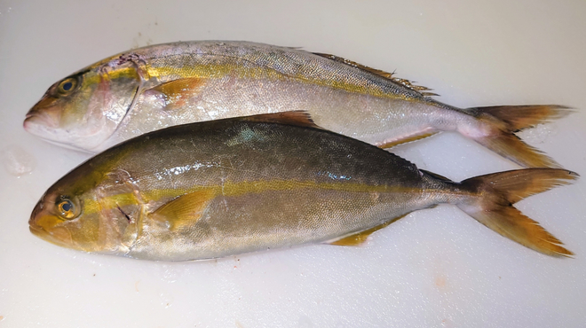 ハマチと見た目がよく似ていますが、魚体が黄色っぽく頭に漢字の八の字のような模様があります。