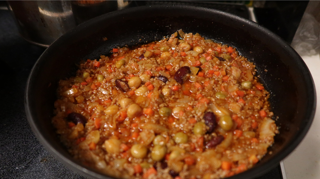 チリコンカンの作り方は、とてもシンプル。ひき肉と玉ねぎを炒めて、キドニービーンズなどの豆やトマト、チリパウダーなどのスパイスを加えて煮込みます。