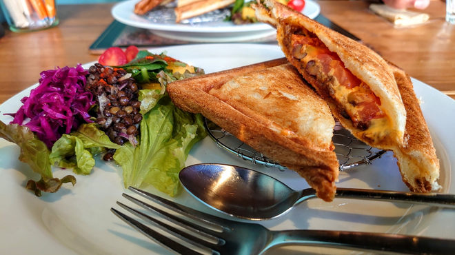 食パンにチリコンカンを挟んで、ホットサンドにしました。カリッと焼いたトーストに、しっかりとした味つけのチリコンカンがよく合い、手が止まらないおいしさですよ。がっつり食べたい日のお弁当にもおすすめの一品です。