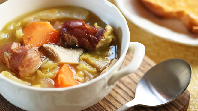 アイスバインをスープやポトフの具材にするのもおすすめ!塩漬けされたお肉から塩気や旨味がスープに溶け出し、野菜の甘みや旨味と混ざり合って深みのある味わいに仕上がります。