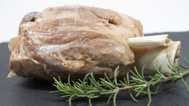 本場ドイツのアイスバインは、骨付きの豚すね肉を使います。骨付き肉を使うと骨からも旨味が出てとてもおいしく仕上がります。ただし、血抜きなどの下処理が必要です。