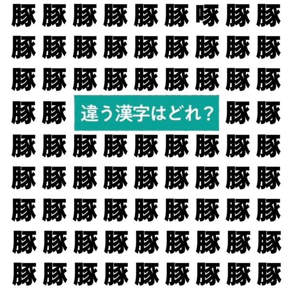 漢字間違い探しクイズに挑戦!たくさん並んだ「豚」の漢字。この中のどこかに、ほかと違う漢字がひとつだけ紛れていますよ。さて、どれでしょうか?よーく見比べながら、答えを当ててみてくださいね。