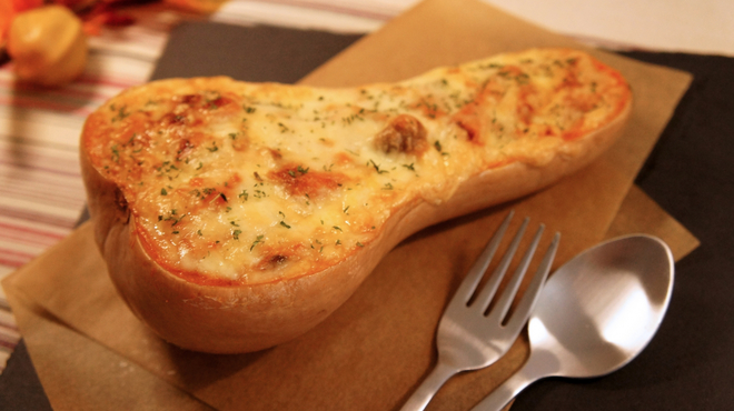 バターナッツかぼちゃを丸ごと使って、グラタンを作ってみましょう。玉ねぎやベーコンを使ったクリーミーなホワイトソースと、ねっとりとした食感のバターナッツかぼちゃが相性抜群ですよ!バターナッツかぼちゃを器に使ったインパクトのある見た目でおもてなしの席にもぴったりの一品です。
