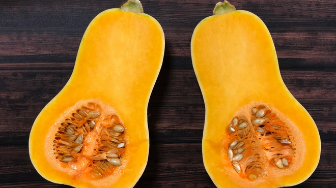 一般的なかぼちゃはホクホクとした食感とやさしい甘みが特徴なのに対し、バターナッツかぼちゃは、ナッツのような甘さと、ねっとりとしたなめらかな食感が魅力。