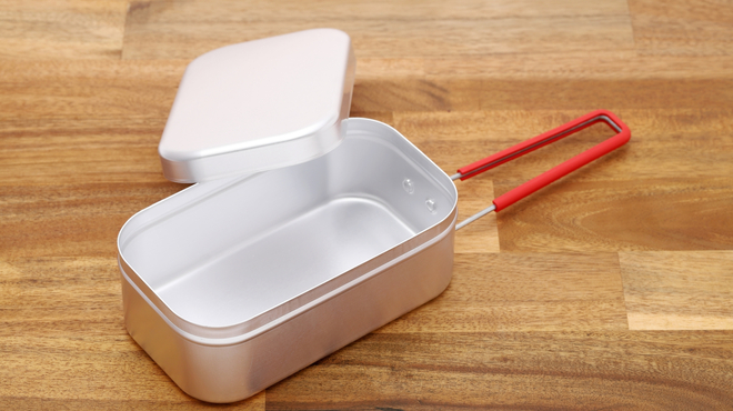 メスティンとは、四角いアルミ製の飯ごう(mess tin)のこと。フタ付きの本体に折りたたみ式のハンドルがついたシンプルな構造で、熱伝導がよく軽くてコンパクトなのが特徴です。