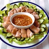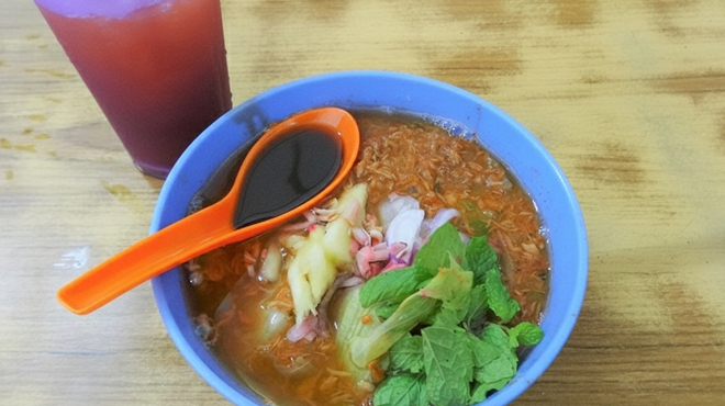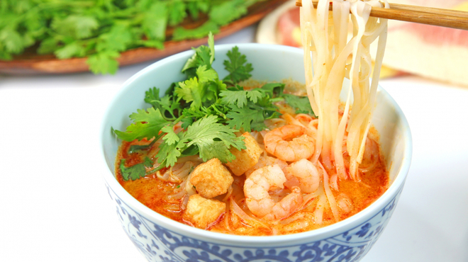 その名の通り、魚のだしにタマリンドの酸味と唐辛子などのスパイスが効いた辛みのあるさっぱりとしたスープが特徴です。魚のほぐし身をスープに加えるため、スープにとろみがついています。パイナップルや玉ねぎ、きゅうり、ミントなどをトッピングし、太めの米麺を使うのが一般的です。独特なクセのあるエビを発酵させたペースト「ヘーコー(蝦膏)」が添えられます。