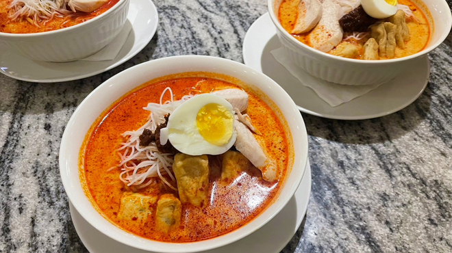 鶏やエビのだしにカレー系のスパイスとココナッツミルクが入っていて、さらにラクサリーフやレモングラス、シナモンなど多種類のスパイスやハーブが使われるため、豊かな香りと複雑で奥深い味わいを楽しめます。
