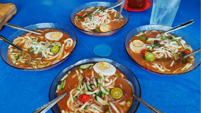 カレーラクサに似ていますが、カレーラクサよりもココナッツミルクが多く、辛さが控えめでまろやかな味わいです。具材はエビや貝、魚のすり身のほか油揚げ、きゅうりなどが多く、麺は米麺と卵麺のミックスが定番なのだとか。カラマンシーやリマウと呼ばれる小ぶりの柑橘を絞り、味の変化を楽しむ食べ方もあります。