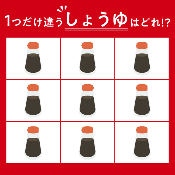 違う絵さがしです!9つ並んでいるしょうゆのイラストの中に、1つだけ違うものがあります。よーく見比べて、異なるイラストを探し当ててくださいね。