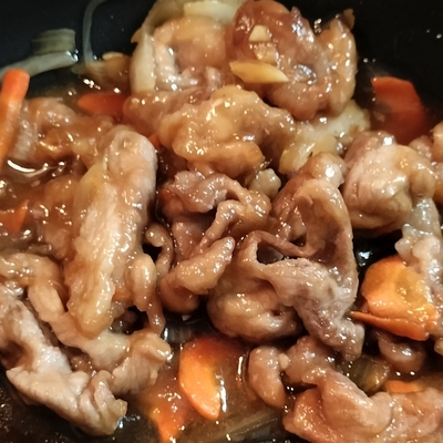 切り落とし肉で脂身少なめですがうまうまです。400グラム、にんにく5かけ、有塩バターで、調味料3倍量、しょうゆ少なめ砂糖多めで好みの甘めに仕上がりました♪