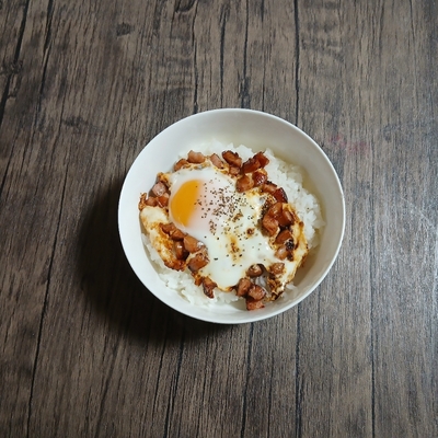 ③白身が半分固まってくれば○を加え、白身が完全に固まり黄身には火が通っていない状態で取り出しご飯の上に盛り付ける。最後にブラックペッパーをかけて完成。