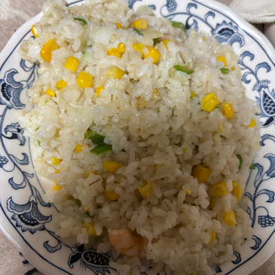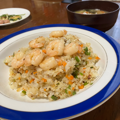 えびに火が通ったら、温かいごはんを加えて、塩(ひとつまみ〜ふたつまみ)、こしょう(適量)で味をととのえて完成。