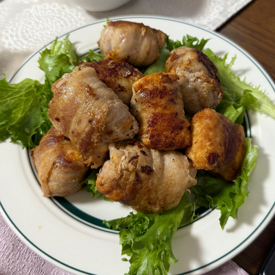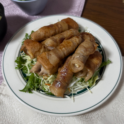 ①厚揚げに豚ロースをまく(ロースの幅に合わせて厚揚げは適宜切る)