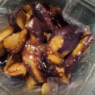 片栗粉をまぶした茄子をアイラップに調味料入れてから投入。軽く揉みながら混ぜる。