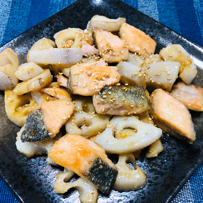 冷凍の塩鮭を使用。鮭にすでに味が付いてた為、れんこんのみ片栗粉をまぶしました。かんたんで美味しいです🧡ブラックペッパーのかけすぎ注意。味見しながら、かけると◎