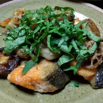生鮭170g、れんこん260g 4倍濃縮のめんつゆを少し多め バターが効いてすごく 美味しかったです♡ 後で大葉のせました♪