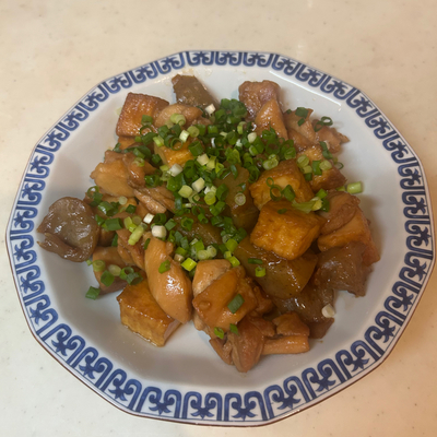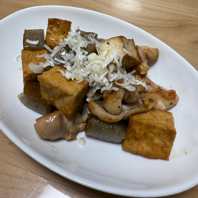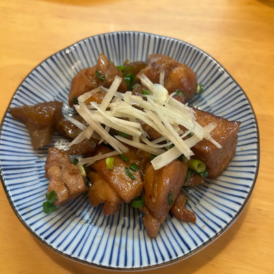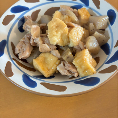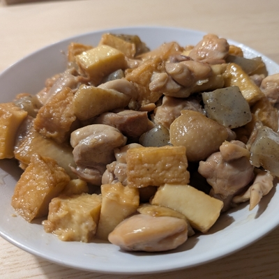 米油の代わりに太白ごま油を使わせていただきました。それで鶏の皮を焼いて、それで鶏油を抽出しました。その鶏油を使って、調理させていただきました。素材全体の美味しさをうまくひとつにまとめることに成功したと感じました。鶏肉が柔らかく、おいしいです。厚揚げもいい感じに味がしみています。こんにゃくもぷりぷりとした食感がとてもいいです。ねぎもわりとたっぷりめにかけるとよいと感じました。お好みで針しょうがを添えるとなおよいかもしれないと感じました。次回また作って食べるときに試してみたいと思いました。