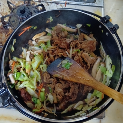 最後にソースと砂糖を加え、全体に絡まるように炒める。
