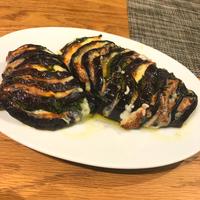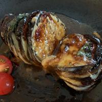 ナスに切りこみを入れて、少し甘めのみそとモッツァレラチーズ、大葉を挟んで焼いた一品です。ごはんのおかずにも、お酒のおつまみにもよく合いますよ。おもてなしにもおすすめなので、ぜひお試しくださいね。