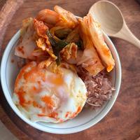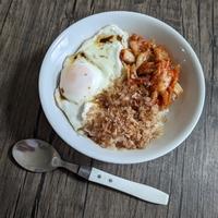 朝食にぴったりな、目玉焼きのせごはんはいかがでしょうか。温かいごはんに、半熟の目玉焼きとキムチをのせ、ごま油としょうゆを混ぜたタレをかけていただきます。キムチの辛さと、ごま油の香りが食欲をそそりますよ。卵を崩してお召し上がりくださいね。