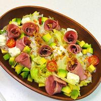 市販のローストビーフをのせた、少し贅沢なシーザーサラダはいかがでしょうか。ローストビーフにクリーミーなシーザードレッシングと半熟卵の濃厚な味わいがよく合い、とてもおいしいですよ。お好みの野菜を加えてアレンジしてみてくださいね。