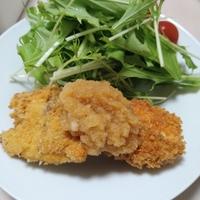 衣は、薄力粉をまぶすのが面倒だったので、卵1個と薄力粉を目分量で混ぜてちょうどいいユルさになったものにくぐらせてからパン粉をギュギュッとつけました。
