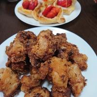 - 2 1に片栗粉をまぶし、170度に熱した油できつね色になるまで揚げます。