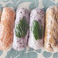 - 5 ラップを敷き、半量の三つ葉、半量の2をのせ、スティック状に握ります。同様にもう1個作ります。