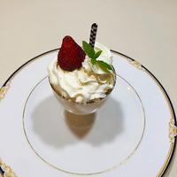 - 5 カップにスポンジ、2、3の順に2段重ねにし最後にトッピング用のいちごとミントの葉を乗せて完成です。