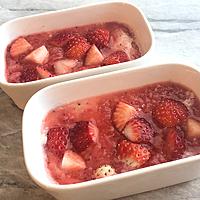 - 8 ソースを作ります。大きめの耐熱ボウルにいちご、(B)を入れてふんわりとラップをかけ、600Wの電子レンジで1分30秒加熱します。いちごの形がなくなるまでフォークでつぶし、粗熱を取ります。