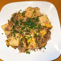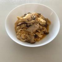 食材同じ。えのきナシ長ネギ追加。豆腐に塩胡椒片栗粉、別フライパンで焼く。豚に酒と片栗粉。調味料は顆粒出汁小さじ1.醤油ひと回し。鰹節と小ネギ。とっても美味しく丁度良いお味でした。