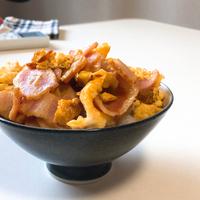 ベーコンを使って作る親子丼風のどんぶりごはんのご紹介です。ベーコンの旨味が出ただし汁をたまごでとじてごはんにのせていただきます。ごろごろと入ったベーコンで食べ応えもあり、簡単にできるので忙しいときや疲れたときにもおすすめです。