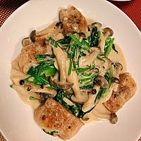 鶏もも肉→鶏むね肉、生クリーム→牛乳、白ワイン→料理酒で代用、きのこは椎茸もプラスし、とろみをつけたくて小さじ1の薄力粉を牛乳小さじ1で溶いた物を足しました。