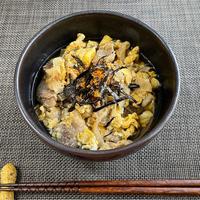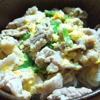 - 4 フライパンに水、(A)を入れて強火で加熱し、煮立ったら1、豚こま切れ肉を入れて中火で煮ます。豚こま切れ肉に火が通ったら溶き卵を回し入れ、卵が半熟状になったら火から下ろします。