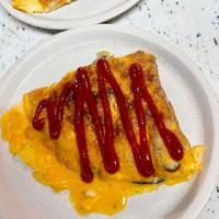 - 4 卵が半熟状になったらスライスチーズ1枚をのせて中火のまま加熱し、チーズがとろけたら半分に折りたたみ、火から下ろします。同じようにもう1つ作ります。