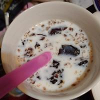 - 4 コップに3をスプーンで崩し入れ、牛乳を注いで完成です。