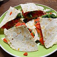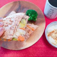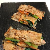 メキシコ料理のファストフード、ケサディーヤに手に入りやすい小松菜とにんじんをたっぷり入れました。とろけたチーズに具材がよく絡んで、とっても美味しいですよ。朝ごはんや軽いお昼ご飯にぴったりの、野菜をしっかり摂れるメニューです。ぜひ作ってみてくださいね!