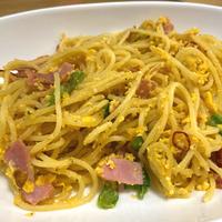 - 6 脂が出てきたら4を加えて強火で炒めます。スパゲティがほぐれて湯気が出てきたら火から下ろし、1を加えてよく混ぜ合わせます。