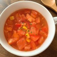 レンジだけで手軽に作れる時短レシピです。フレッシュトマトやミニトマトを使って、コンソメで味付けするだけの簡単スープ。仕上げにバターを加えると酸味が抑えられて濃厚な味わいに。玉ねぎやコーン、ブロッコリーなどお好みの野菜を加えてアレンジも楽しめます。朝食からディナーまで幅広く活躍する一品で、パスタと合わせても美味しくいただけます。