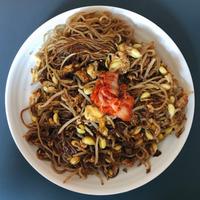 - 1 耐熱ボウルに焼きそば麺を入れて、ラップをかけ、600Wの電子レンジで1分30秒加熱します。