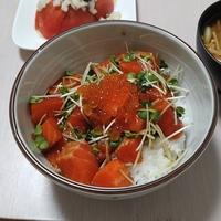 時短、かいわれ大根なし。漬け汁なし。サーモンを斜めに大きく切って、いくらをのせました✨7歳子供マラソン大会後の、晩御飯‼️