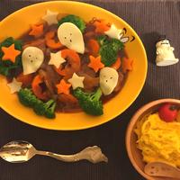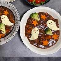 炊飯器で作る、簡単ポークシチューのご紹介です。ジャックオランタン型のごはんを添えて、かわいく仕上げました。お好みのデコレーションでお楽しみくださいね。