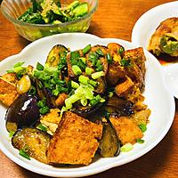 茄子にある程度火が通ったらフライパンの片側に寄せて、空いてる部分で厚揚げを炒め、厚揚げがこんがりしてから混ぜ合わせ、調味料を投入。厚揚げも崩れずに出来ました。甘辛系で美味しいです。