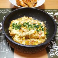 - 3 中火で熱したスキレットに有塩バターを溶かし、コーン、2を入れ薄切りハーフベーコンがしんなりするまで炒めます。