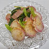 ラディッシュが少し苦かった、、けど見た目可愛いです。使わない葉はベーコンと醤油で炒めました。